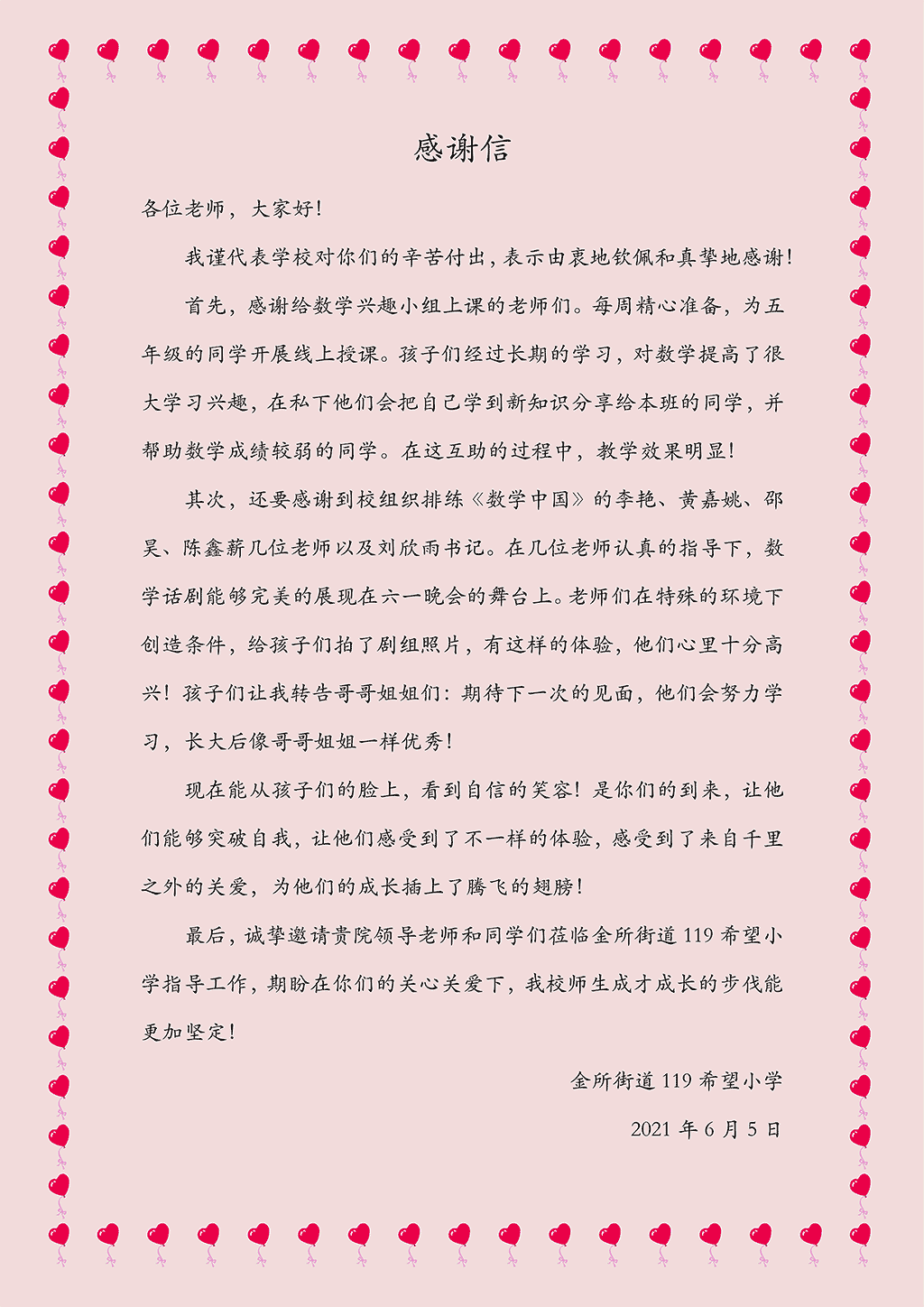 前期在金所119 希望小学老师们的帮助下,参演话剧的同学们已确定角色、基本熟悉台词。5 月下旬,学院团委书记刘欣雨带领话剧指导团队来到金所119 希望小学,对孩子们进行现场指导、组织排练。排练期间,团队负责人李艳为学生们介绍话剧《数学中国》的故事背景,与学生们沟通交流感想,以此激发学生的家国情怀和对数学的学习兴趣。饰演数学家熊庆来的演员程志杰说,"数学家熊庆来是华罗庚的老师,他还是云南人呢!能够饰演这个角色我感到无比骄傲,我也要向他们学习,认真学好数学,长大后做一位对社会有贡献的人!"