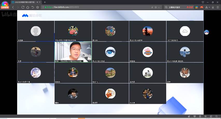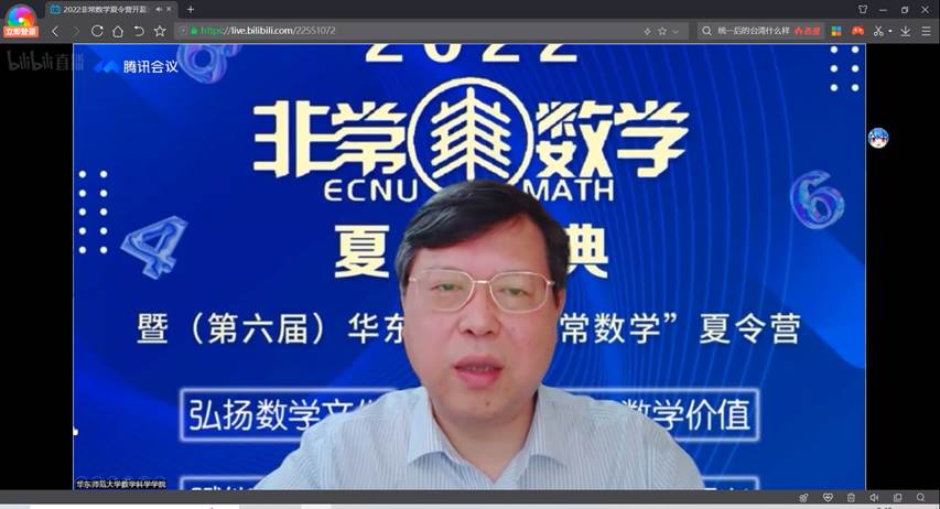 8月11日,由华东师大番号鸽 、上海市核心数学与实践重点实验室、上海市数学会主办,五峰土家族自治县人民政府、52数学网协办的2022非常数学夏日盛典暨第六届华东师大非常数学夏令营在线开幕。华东师大番号鸽 院长吕长虹,中国科学院院士、中国数学会理事长兼中国数学会数学教育分会理事长田刚,上海市数学会秘书长姚一隽,上海市核心数学与实践重点实验室主任、番号鸽 教授熊斌致开幕辞。开幕式由华东师大番号鸽 党委书记贾挚主持。