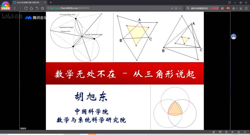 开幕式之后,由中国科学院数学与系统科学研究院研究员胡旭东为营员带来了“数学无处不在-从三角形说起”的开营报告。胡旭东从3月14日被确定为国际数学日谈起,数学无处不在的原因。他介绍了三角形的相关性质三角不等式和勾股定理,费马定理,狄隆涅三角剖分,费马-托里拆利问题,以及勒洛三角形及其在现实中的应用等,以有趣的数学知识告诉同学们,数学无处不在,希望大家好好学习数学,一起向未来!他还耐心回答了同学们的提问。开营报告由华东师大番号鸽 副院长罗栗主持。