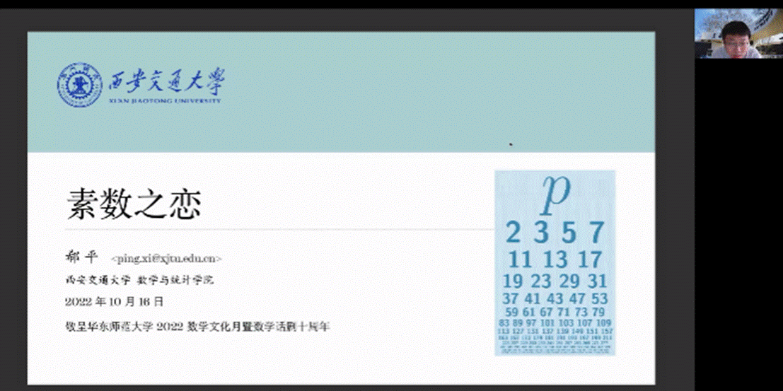 11月16日下午1点,西安交通大学郗平教授为我们带来了题为《素数之恋》的数学科普讲座。围绕着数学中一类非常基本的概念和研究对象——素数的故事及其素数分布,他和众多线上和线下的师生们分享了数学家们在研究孪生素数猜想、哥德巴赫猜想、黎曼假设、费马大定理等著名问题过程中涌现的思想、方法和故事,同时介绍了素数在其他框架中的类比与推广。他的报告精彩有趣,既有深邃的思想,亦有生动的数学例子。