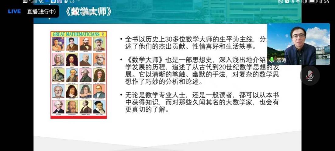 11月25日上午8点半,北京师范大学-香港浸会大学联合国际学院(UIC)校长汤涛院士为我们带来了题为《贝尔的<数学大师>》的数学科普讲座。在他的精彩报告中,汤涛教授从E.T.贝尔的科普名著《数学大师》一书出发,和听众们分享了这部著作出版的时代背景、书中的数学家故事内容及其文化影响力。他希望年轻的同学们可以从中获得启迪,为当代中国的数学普及和文化传播贡献一己之力。