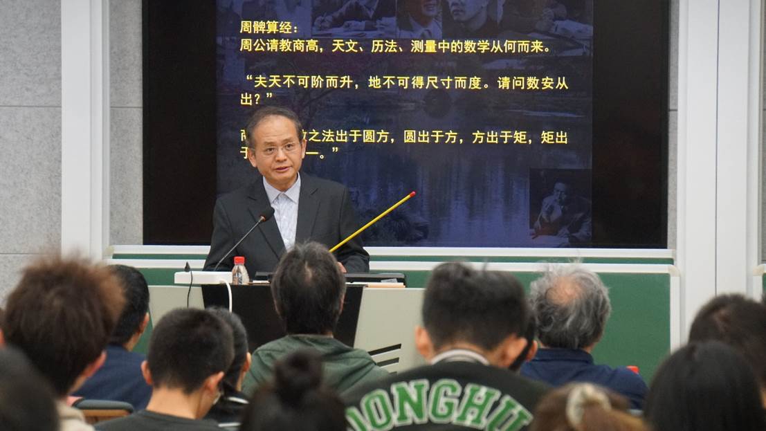 周院士首先介绍了数学史中勾股定理的不同证明方法,重点介绍了商高对勾股定理的证明,包括商高的“折矩”思想和“环而共盘”思想,令人耳目一新。紧接着,周院士通过介绍赵爽证明平方差公式、为《周髀算经》作序作注、撰写论文《勾股论》等工作,肯定了赵爽对中华数学文化发展与传承做出的贡献。周院士列举了多个几何、群论、拓扑领域中的不变量,说明了“形体不变量”思想也是现代数学的核心思想。周院士介绍了中国古代极限思想,说明了数学思想在中国古代核心人文思想中的表现。此外,周院士还介绍了多复变函数论的主要研究对象和内容,解释了全纯不变量和全纯域的定义,介绍了多复变的近期进展以及它们和代数几何、微分几何、复几何的联系。