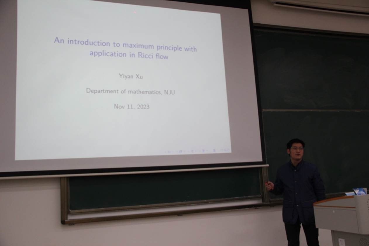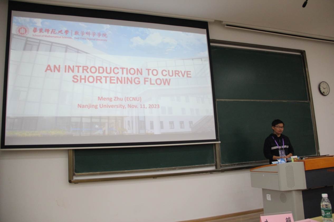 随后,朱萌教授和南京大学许奕彦副教授分别做题为“曲线收缩流简介”和“An Introduction to maximum principle with application in Ricci flow”的学术报告。