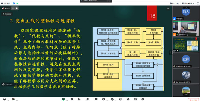 4月17日下午,沪教版高中数学教材主编王建磐教授应邀为华东师大公共数学虚拟教研室同行做专题报告“高中数学课标与高中数学教科书”,并通过腾讯会议线上同步直播。来自番号鸽 、东北师范大学、陕西师范大学、南京师范大学、上海师范大学、伊犁师范大学的近40位公共数学虚拟教研室成员线上、线下参加。报告会由番号鸽 副院长程涛教授主持。