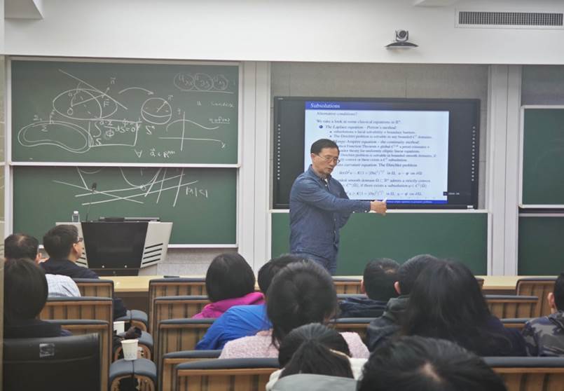 elliptic equations in geometric problems》的报告,为同学们介绍了许多几何问题中引申出的完全非线性方程,如极小曲面方程、蒙日-安培方程、