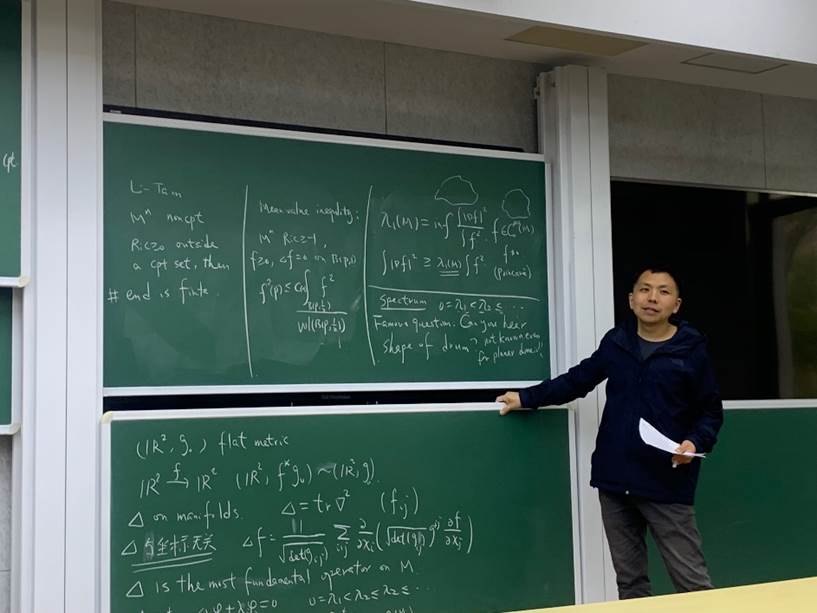 4月19日,刘钢教授做题为《流形上的函数论》的报告。刘老师从黎曼流形上的拉普拉斯算子开始,围绕调和函数和特征函数的性质和相关应用进行了深入浅出的介绍。