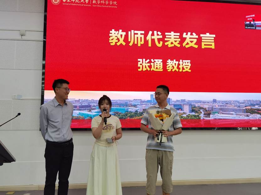 2024级新生代表代表刘天宇向教师代表张通献上鲜花,祝福所有老师教师节快乐。