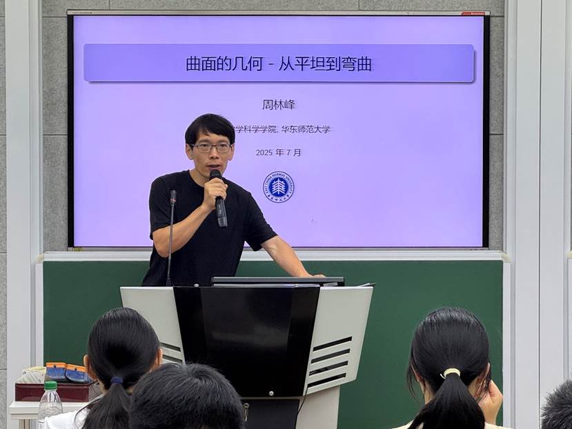 几何与拓扑团队的周林峰老师作报告“曲面的几何-从平坦到弯曲”,主要介绍了欧氏平面上的等距群,引出三反射定理和与欧氏平面局部等距的曲面分类定理。