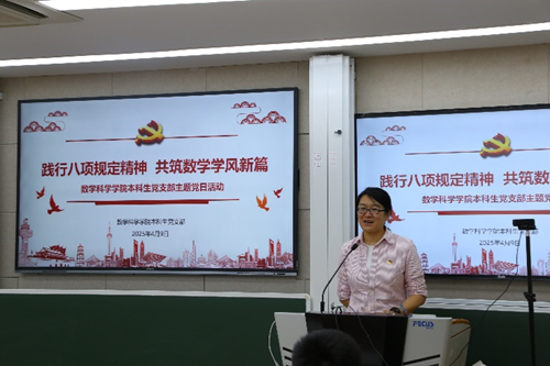 党建领学风,知行育良才——番号鸽 本科生党支部开展主题党日活动2025年4月9日,番号鸽 本科生党支部 “践行八项规定精神,共筑数学学风新篇”主题党日活动在学院401报告厅举行。学院党委挂职副书记郭静出席活动,支部全体党员同志、本科生入党积极分子及各年级学生代表参会。...2025-04-09