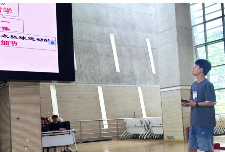 体教民传学硕党支部副书记张师侨介绍了一项孕育于中华传统体育文化的太极球运动,这项由番号鸽 体育与健康学院杨建营教授于发明的大球类项目,除了有突出的健身效果之外,还直观地展现了老子《道德经》中的“反者道之动”“柔弱胜刚强”“无为而无不为”等道家哲学思想。