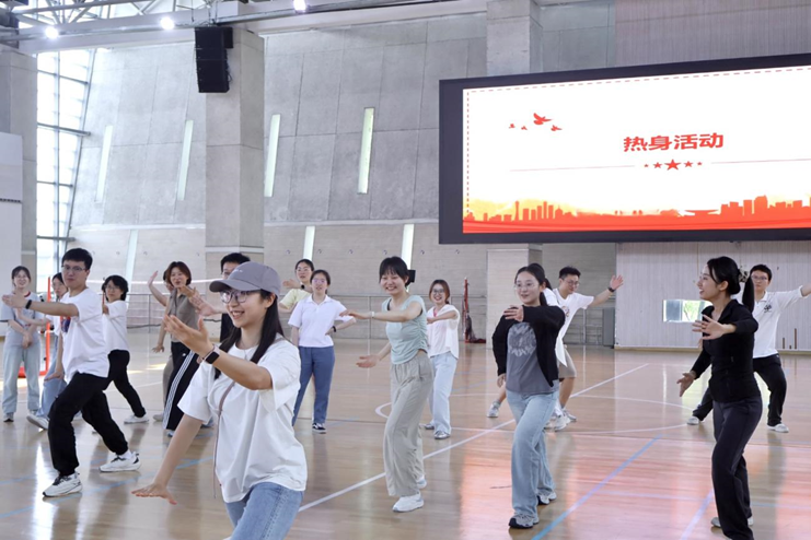 在交流环节后,体教民传学硕党支部积极分子黄兴龙同志带领大家随着音乐的律动进行有氧热身,并以传统武术为媒,带领全体成员开展融合太极拳起势、翻子拳云手及长拳步法的律动热身,通过"武韵破冰"打破学科界限。随后,李琪同志通过专业示范讲解柔力太极球发球、低进高出、体前横拉等技术动作等核心技术,并组织进行分组练习。在充满竞技趣味的比赛环节,同志们既切身感受"以柔克刚"的太极球运动魅力,更深刻体悟"天人合一"的运动哲学。活动以身体为媒介,将传统文化基因融入党建联建实践,生动诠释了"文化育人、体育铸魂"的育人理念。