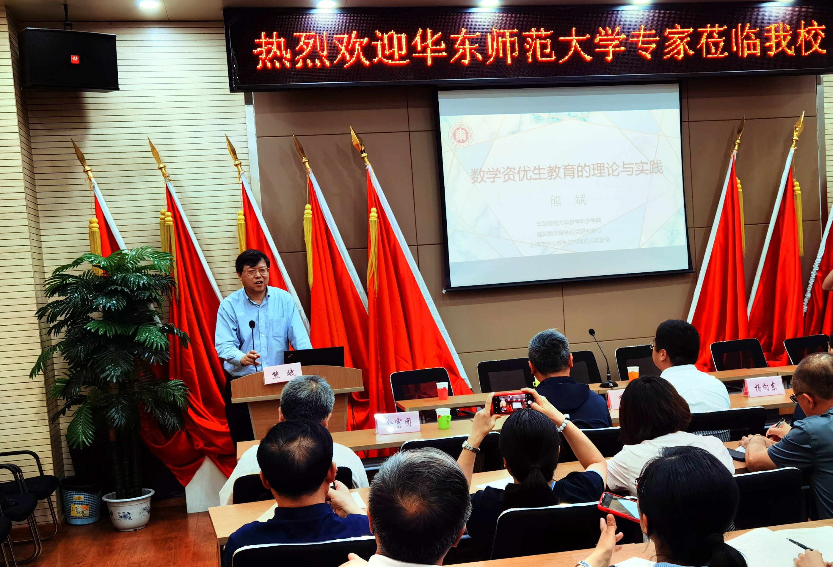 熊斌教授面向数学教师做题为“数学资优生教育的理论与实践”的报告,从背景、数学资优生的价值、内涵、选拔、培养等五方面进行介绍,并从制度保障、课程建设、师资培养、因材施教等四方面总结启示。此外,熊斌老师介绍了数学奥林匹克竞赛的相关情况及韦东奕等国际奥赛金牌获得者的成就。报告结束后,基础数学党支部一行与五中部分教师进行座谈。熊斌教授就课程规划、教师能力提升等方面的问题一一解答,庞学诚教授鼓励老师们要勇于自编题目、改编题目,追求教学艺术,做有心的教师。