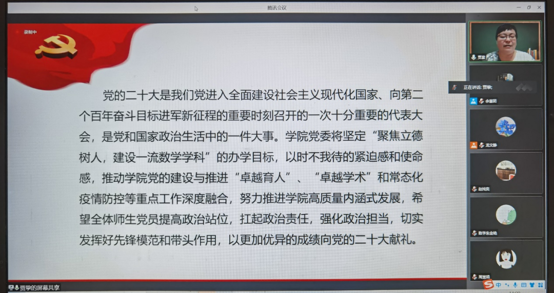 会上,贾挚介绍了党的十九届六中全会的重大成就和重大意义,重点讲述了全会审议通过的《中共中央关于党的百年奋斗重大成就和历史经验的决议》(以下简称《决议》)的主要内容和重大创新,以“一条主线、四项伟大成就、百年四大飞跃、四个庄严宣告、马克思主义中国化的三次飞跃、十大明确、两个确立、五大历史意义、十条经验”为重点,带领大家了解决议的结构和脉络,提升大家对六中全会决定重大意义的深刻认识。她强调要充分认识《决议》的重大意义,坚决维护两个确立,必须抓好后继有人这个根本大计。党的二十大是我们党进入全面建设社会主义现代化国家、向第二个百年奋斗目标进军新征程的重要时刻召开的一次十分重要的代表大会,是党和国家政治生活中的一件大事。学院党委将坚定“聚焦立德树人,建设一流数学学科”的办学目标,准确把握全会精神实质,以时不我待的紧迫感和使命感,推动学院党的建设与推进“卓越育人”、“卓越学术”和常态化疫情防控等重点工作深度融合,努力推进学院高质量内涵式发展。她希望全体师生党员提高政治站位,扛起政治责任,强化政治担当,切实发挥好先锋模范和带头作用,以更加优异的成绩向党的二十大献礼。