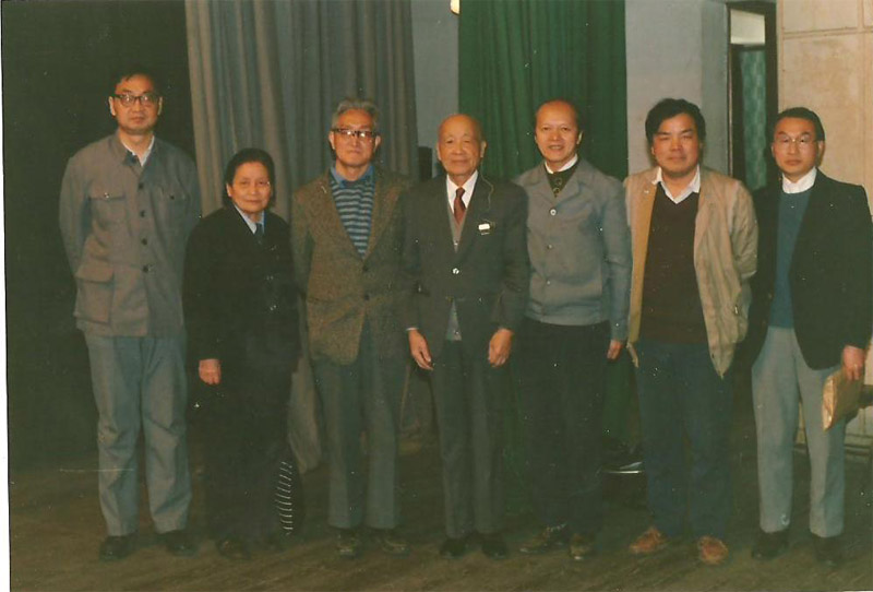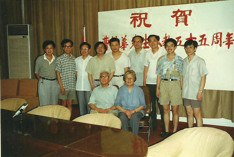 左图是数学系举办的执教55周年纪念会,前排左起曹锡华和夫人陈希仑,后排左起:瞿森荣,林磊,陈志杰,王建磐, 肖刚,刘昌堃,邱森,谈胜利,韩士安;右图左起:查建国、唐秀颖,曹锡华,苏步青,谷超豪,蒋尔雄,胡毓达