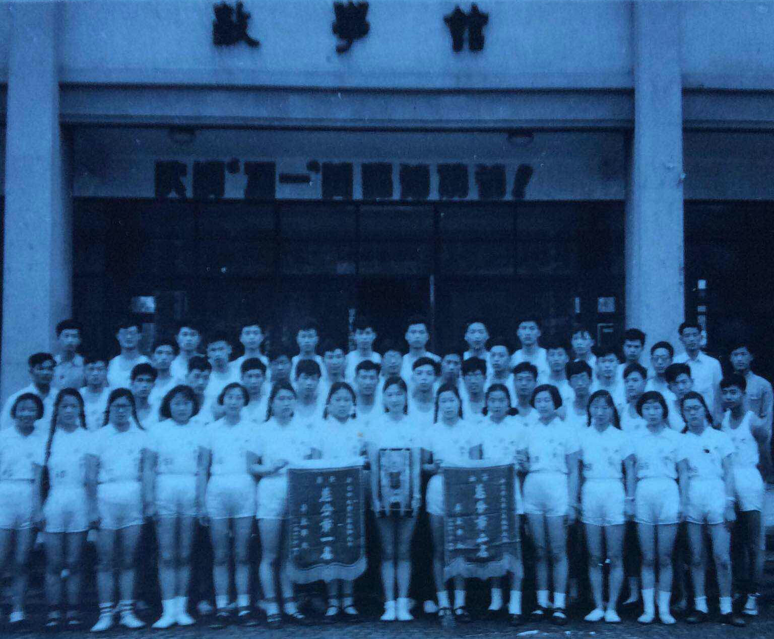 1960年校运会上获得男子总分第一名和女子总分第二名的数学系田径队合影。其中男队有吴荣志(二排左一)、陈骏元(二排左二)、 朱鋐道(二排左四)、洪渊(二排左五)、陆仲伟(二排左八)、唐清成(二排右四)、邱森(二排右二)、姚季辰(二排右一)、张梦祥(三排左一)、马长路(三排左二)、司鸿业(三排右一)、 赵德茂(后排左一)、吕嘉陵(后排左三)、叶福义(后排左四)、陈江中(后排左五)、刘德新(后排左六)、曹茂良(后排右二)、方学荣(后排右五)等, 女队有崔家华(前排左一)、丁玉如(前排左五)、婁爱华(前排左六)、姚婷婷(前排左七)、曾雅施(前排左九)、陈丽珍(前排右四)、王玲玲(前排右三)、沈安安(前排右一)等 (点击照片可显示更清晰大图)