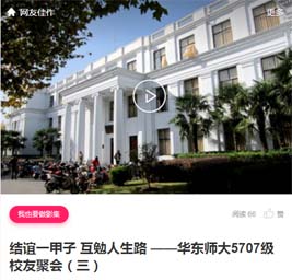 2017年10月,5707级校友举办入校60周年聚会,适逢校庆66周年,又逢数学系校友联谊会成立,也是多数老同学80大寿的欢庆日子,真是喜上加喜!校友们回到共同的‘家’,感恩母校,感恩老师,回忆同窗情,互勉人生路!有声影集记录了聚会的热烈场景。影集共分4集,点击以下4个图就可以在电脑或手机上观看,手机观看效果更佳。也可以用手机扫描以下二维码观看。