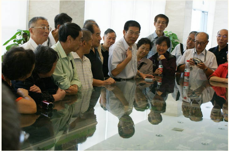 聚会第二天,我们一同参观了闵行新校区。校友会秘书长、校长助理杨伟民先生亲自介绍了新校区的筹建和规划,生动的语言和逼真的模型让大家听得津津有味。 我们为母校的快速发展深感自豪,对华东师大新一轮的发展和腾飞充满信心。事后还参观了“爱心之屋”、“实验基地”、“图书馆”, 在图书馆前又留下了第二次激情的合影。最后又到了数学楼,看了历经半世纪变化后的新资料室、微机室等,意犹未尽,大家默默地为数学系的发展祝福。
