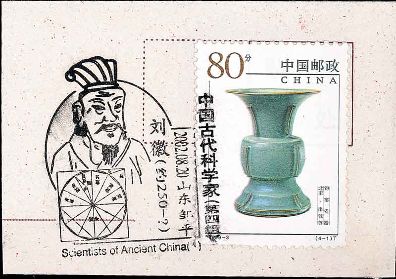 图3是东汉科学家张衡(78-139), 他在天文测量中得出圆周率π的两个近似值3.1466和3.1623, 这比印度和阿拉伯人早了500年. 图4是魏晋时期数学家刘徽(公元3世纪, 山东人, 图5是山东邮政刻制的首日纪念邮戳). 他在《九章算术·圆田术》注中, 用割圆术得出圆面积与周长的关系式和圆周率的计算方法(参见图6中上部和图7, 它们分别是中国邮资明信片和密克罗尼西亚邮票). 由此得到π=3927/1250=3.1416, 通称它为“徽率”. 请注意刘徽在割圆术中提出的“割之弥细, 所失弥少, 割之又割以至于不可割, 则与圆合体而无所失矣”, 这种计算思想就是当今的极限概念. 图8是南北朝时期数学家祖冲之(429-500, 中国小型张), 他则更计算出圆周率π在3.1415926和3.1415927之间, 并给出π的两个分数近似值: 约率22/7和密率355/113. 这些都比欧洲人早了一千年.