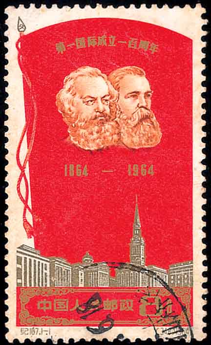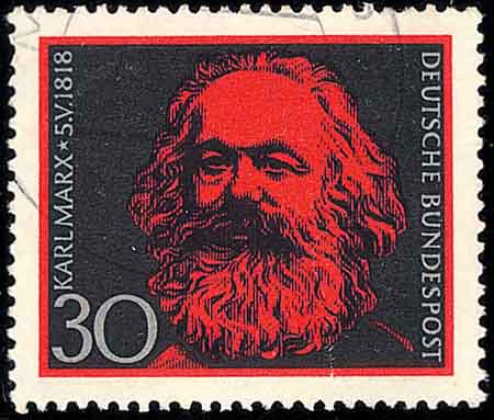 近代德国哲学家马克思(Karl Heinrich Marx, 1818-1883, 图7是德国邮票)和恩格斯(Friedrich Engels, 1820-1895, 图8是罗马尼亚邮票)在创立马克思主义(图9是中国邮票)的同时也学习和研究数学. 为此, 马克思留下他的《数学手稿》. 恩格斯在《反杜林论》中对“数学”作精辟的描述说: 数学是研究现实世界中数量关系和空间形式的科学.