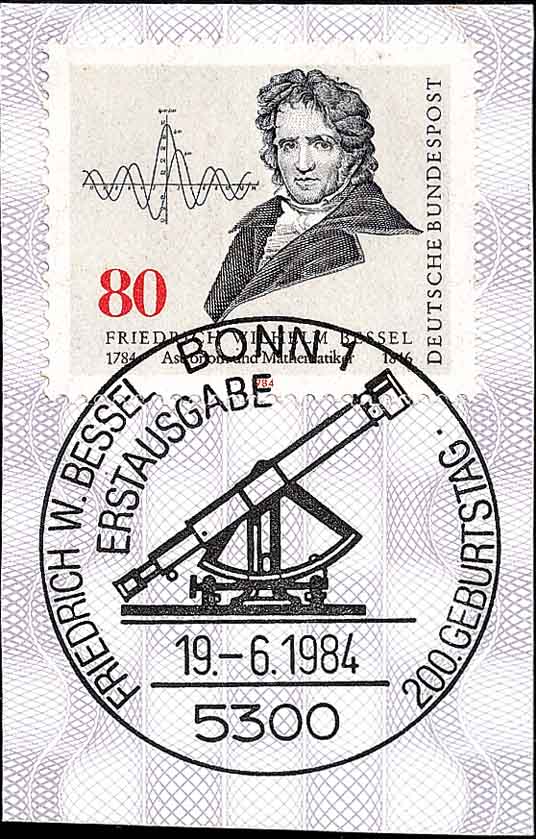 德国天文学家贝塞尔(Friedrich Wilhelm Bessel,1784-1846,图7为1984年德国发行的纪念贝塞尔的邮票)的主要贡献在天文学, 他的著作《天文学基础》(1818)发展了实验天文学,他还编制基本星表,测定恒星视差,预言伴星的存在,并导出用于天文计算的贝塞尔公式。 他在数学研究中提出了贝塞尔函数,讨论了该函数的一系列性质及其求值方法,为解决物理学和天文学的有关问题提供了重要工具。