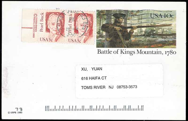 在欧美一些发达国家,当邮局收到寄信者的邮件时,都在邮件某一固定位置上打印条形码(图5下端,美国,2001年实寄),这有利于用计算机来分拣邮件(图6,法国邮戳,2001)。