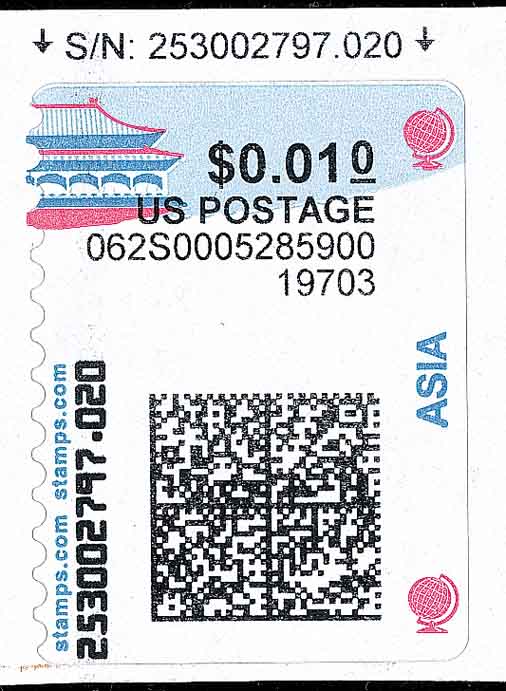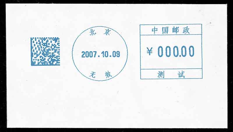 科学在进步,如今在条形码的基础上,又出现了二维码,它可以在很小的方块上存储更多的数据信息。二维码在欧美一些国家已经广泛应用于各项邮政业务, 如电子邮票(图7,美国,2004)、 电子邮资标签(图8,德国,2007)等等。2007年以来,中国邮政二维码的应用已在不同品牌的邮资机上进行试验(图9,中国试机邮戳,2007)。
