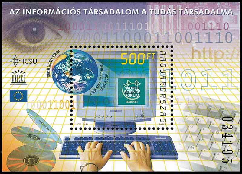 我们日常用的是十进位制,即逢十进一位。而在电子计算机上用的是二进位制,因为电子计算机是依靠电流来运作的。对于一个电路节点来说,电流通过只有通电和断电两种状态。 计算机上信息存储常用磁盘,而磁盘上的每一个记录点,也只有磁化和未磁化两种状态。如果用光盘记录信息,光盘上每一个信息点的物理状态也只有凹和凸两种, 它们分别起着聚光和散光的作用。由此可见,计算机上所使用的各种介质只有两种状态。对这两种状态分别用0和1(图1为巴基斯坦邮票)来表示。 这就使得二进位制成为电子计算机各项工作的基础。通常,我们向电子计算机输入数据,都要先被转换成二进位制后,计算机才能按人们的设计进行工作。 图2是以0、1为画面背景的邮票,它是为2003年在匈牙利布达佩斯举办的世界科学论坛而发行的。