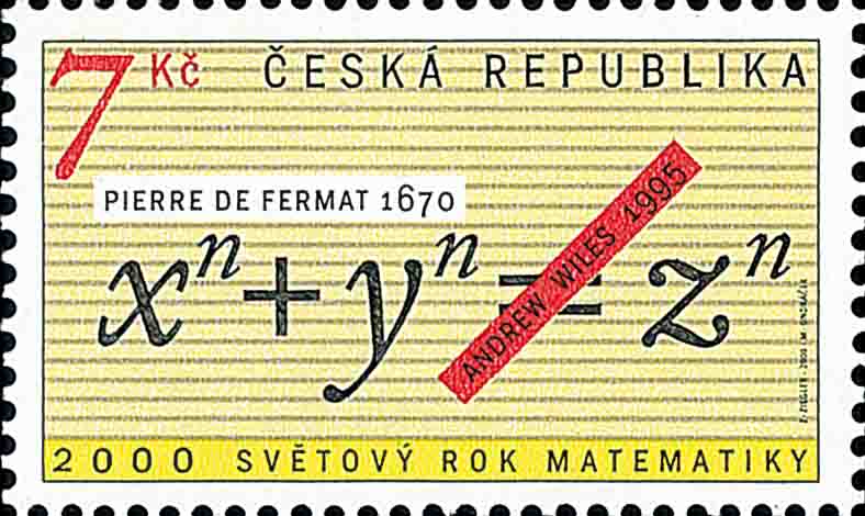 关于费马大定理, 在过去 300 多年里, 许多数学家 (包含一些著名的数学家如: 欧拉、 高斯、 柯西等) 都力图去证明它, 但都未能得到满意的结果. 或者只能证明当 n=3、4、5、7 时定理成立. 二战后随着计算机的出现, 大量的计算已不再成为问题. 借助计算机, 也只能证明: 当 n 小于等于 4100 万时, 费马大定理是正确的. 这种成功仅仅是表面的, 即使范围再提高, 也永远不能证明到无穷, 不能宣称定理已经证明. 一直到 1995 年, 美国普林斯顿大学的安德鲁·怀尔斯 (Andrew Wiles) 经过 8 年的奋战, 用 130 页长的篇幅才完整证明了费马大定理. 图 6 是捷克 2000 年发行的邮票, 票图中指出: 1670 年费马提出他的定理和 1995 年怀尔斯证明了这个定理.