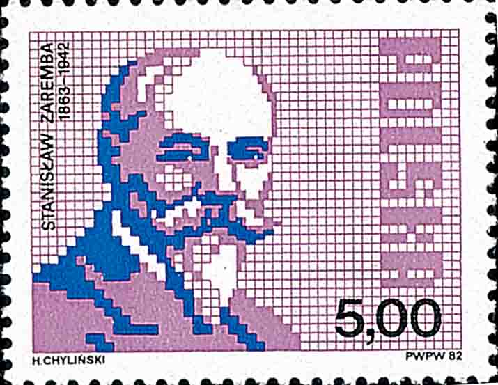第 19 届国际数学家大会原定 1982 年在波兰举行, 但由于当时波兰政治局势使得这次大会被推迟到 1983 年在华沙召开. 而波兰邮政当局已在 1982 年就发行了一套代表现代波兰数学学派的四位数学家邮票, 以迎接这次大会的召开. 这四枚邮票依次是 图 3 斯坦斯洛·扎列姆巴 (Stanislaw Zaremba, 1863--1942), 他主要研究三重积分极大值问题和古典狄利克雷问题的不可解情形等; 图 4 瓦西罗·谢尔平斯基 (Waclaw Sierpinski, 1882--1969), 在数论和集合论方面曾有不少贡献; 图 5 谢吉姆特·雅尼谢夫斯基 (Zygmunt Janiszewski, 1888--1920), 他主要从事集合论、 拓扑学和数学基础等方面研究; 图 6 斯特凡·巴拿赫 (Stefan Banach, 1892--1945), 他系统创立了巴拿赫空间理论, 是现代泛函分析的创始人之一. 这次大会还有一个亮点是美籍中国数学家丘成桐获得费尔兹奖章 (由于诺贝尔不设数学奖, 费尔兹奖章已经成为国际上最重要的数学大奖, 常被誉为数学界的诺贝尔奖). 丘成桐出生于广东省汕头市, 后移居香港, 随后在美国深造和工作. 他的贡献主要在整体微分几何和椭圆偏微分方程邻域中做出了极其深刻的工作.