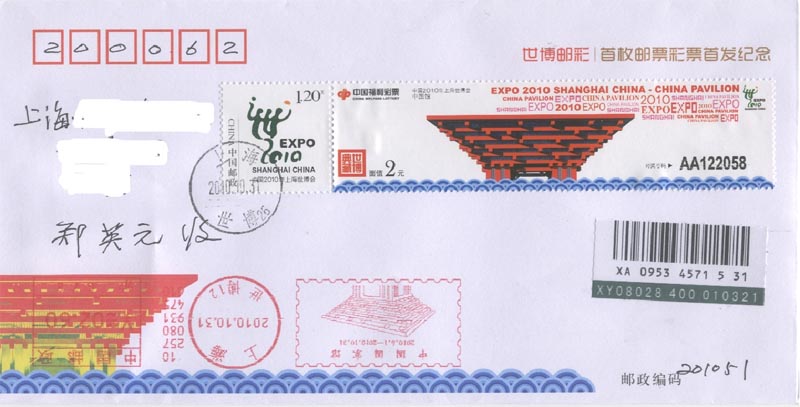 中国邮政集团公司、中国福利彩票发行管理中心、上海世博会事务协调局共同联手,设计、制作、发行的中国邮政/中国福利彩票世博主题“邮彩联票”于2010年10月9日面市。 “邮彩联票”选取世博会这一重大主题,将邮票和彩票有机结合,在世界邮政和彩票业开创了先河。邮彩联票共有4种票面图案,分别采用中国馆(图67)、文化中心、 世博中心和主题馆四个场馆外景图案。